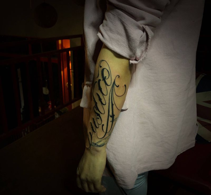 当前位置: 首页 >云南省红河哈尼族彝族自治州纹身店-MD刺青俱乐部纹身图案>字母纹身图片_手臂花体纹身图案