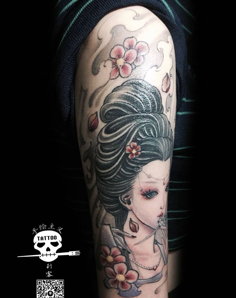当前位置: 首页 >云南省文山苗族自治州纹身店-手绘主义刺客纹身图案>艺妓纹身图片_成品手臂传统肖像人物纹身图案