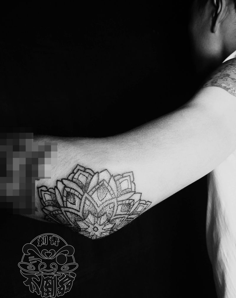 当前位置: 首页 >云南省大理白族自治州纹身店-不倒翁刺青穿孔(大理店)纹身图案>图腾肘花纹身图片_图腾纹身图案