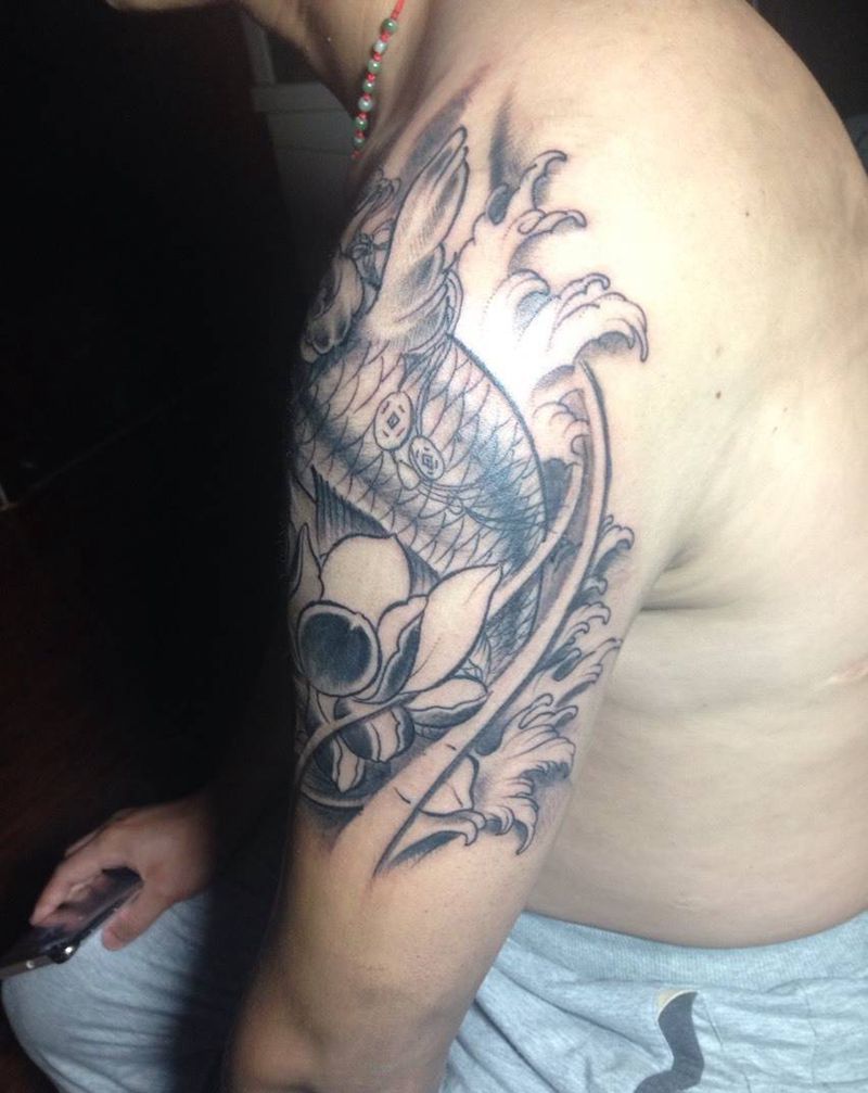 锦鲤叼如意纹身图片_成品肩部传统动物纹身图案