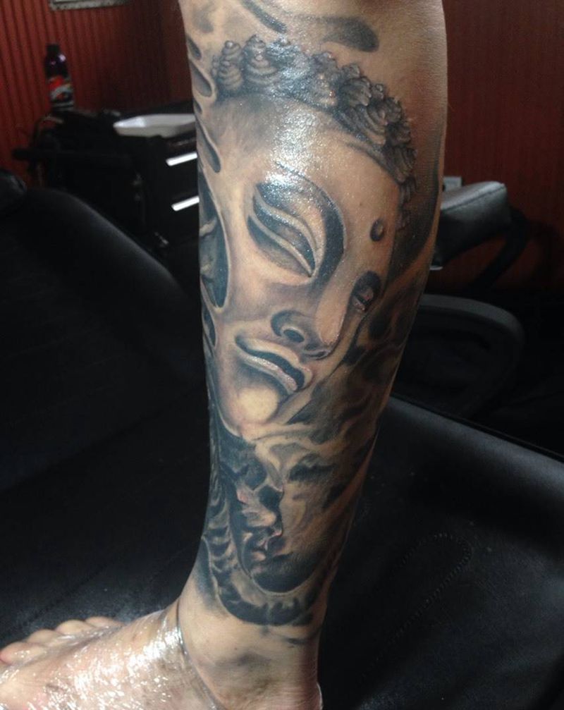 当前位置: 首页 >云南省大理白族自治州纹身店-不倒翁刺青穿孔(大理店)纹身图案>佛与魔纹身图片_成品腿部传统纹身图案