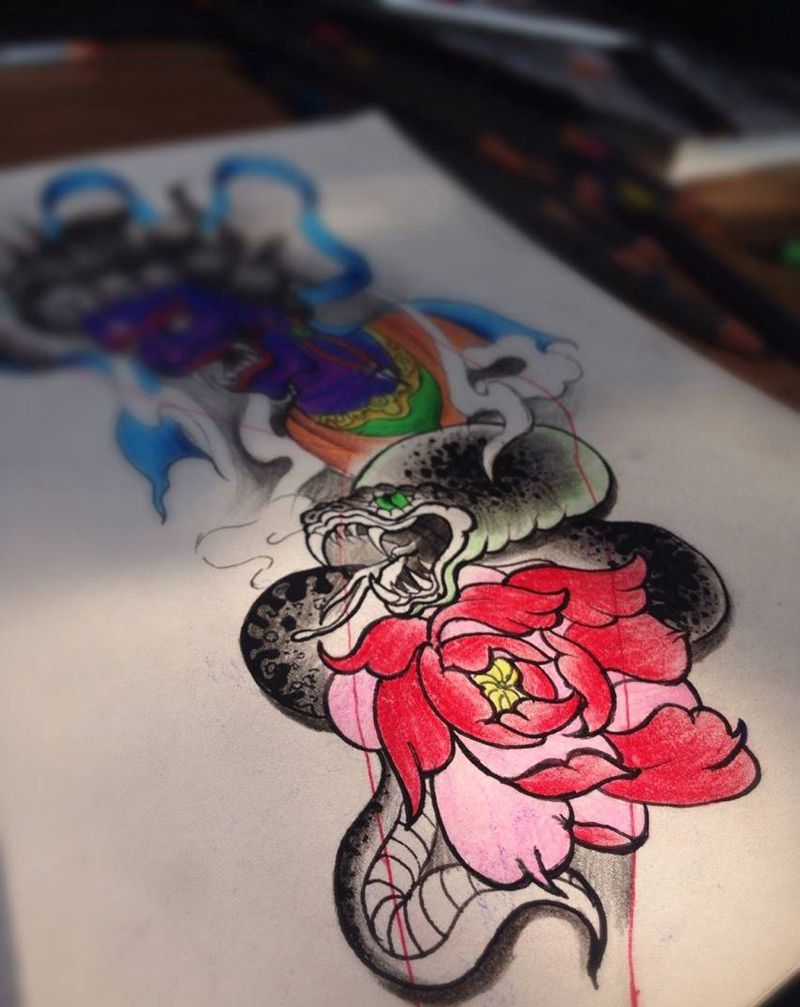 黑天,牡丹与蛇~《原创》纹身图片_手稿手臂传统纹身图案