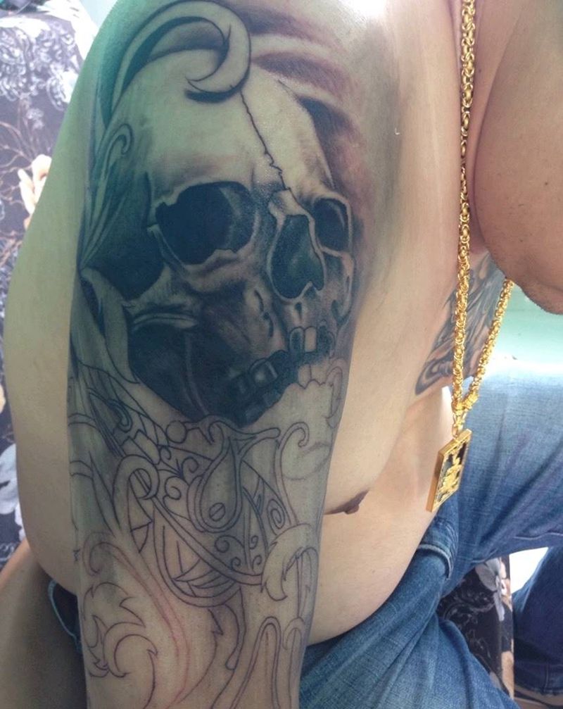 当前位置: 首页 >云南省大理白族自治州纹身店-不倒翁刺青穿孔(大理店)纹身图案>骷髅与枪~纹身图片_手臂欧美纹身图案