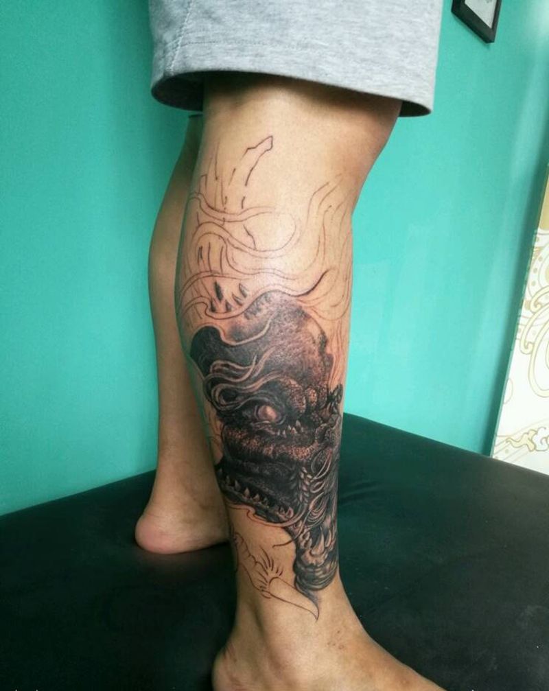 当前位置: 首页 >云南省大理白族自治州纹身店-不倒翁刺青穿孔(大理店)纹身图案>龙包小腿,进度~纹身图片
