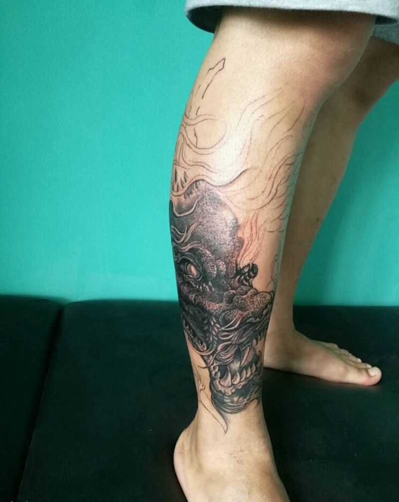 当前位置: 首页 >云南省大理白族自治州纹身店-不倒翁刺青穿孔(大理店)纹身图案>龙包小腿,进度~纹身图片