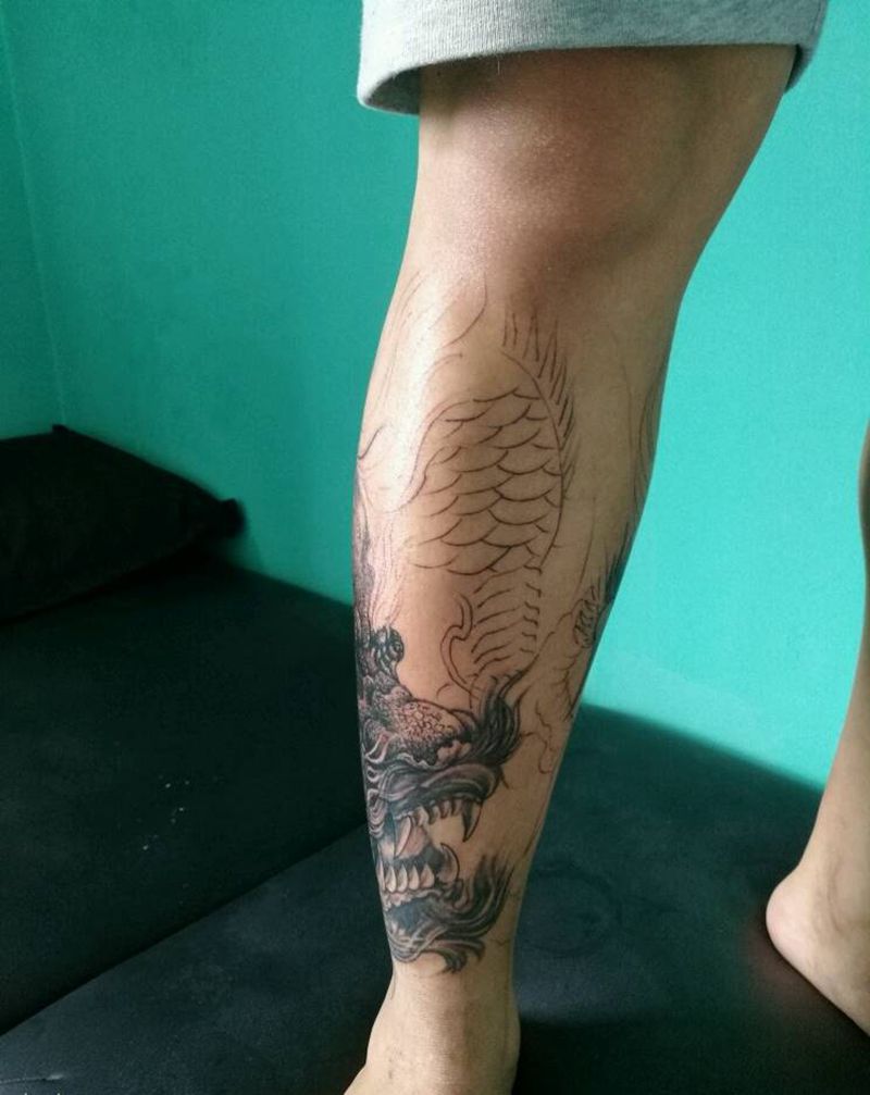 当前位置: 首页 >云南省大理白族自治州纹身店-不倒翁刺青穿孔(大理店)纹身图案>龙包小腿,进度~纹身图片