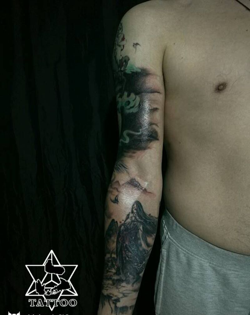 当前位置: 首页 >云南省大理白族自治州纹身店-不倒翁刺青穿孔(大理店)纹身图案>执纹身图片_手臂水墨国画大理成品纹身图案