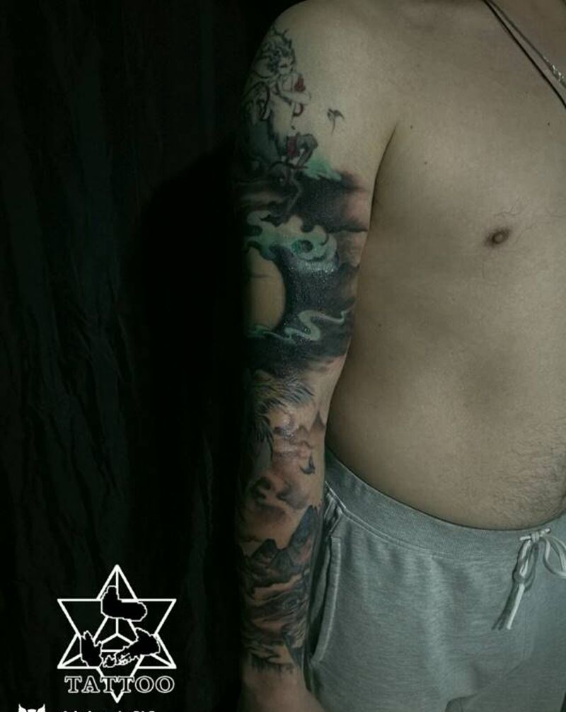 当前位置: 首页 >云南省大理白族自治州纹身店-不倒翁刺青穿孔(大理店)纹身图案>执纹身图片_手臂水墨国画大理成品纹身图案