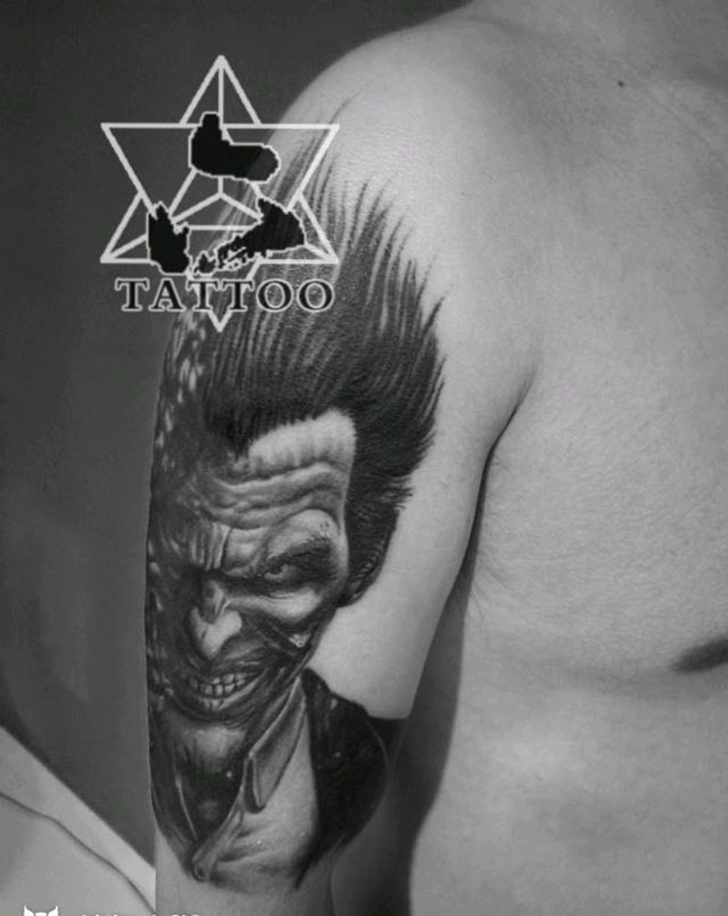 当前位置: 首页 >云南省大理白族自治州纹身店-不倒翁刺青穿孔(大理店)纹身图案>小丑纹身图片_肩部肖像大理六刺青成品纹身图案