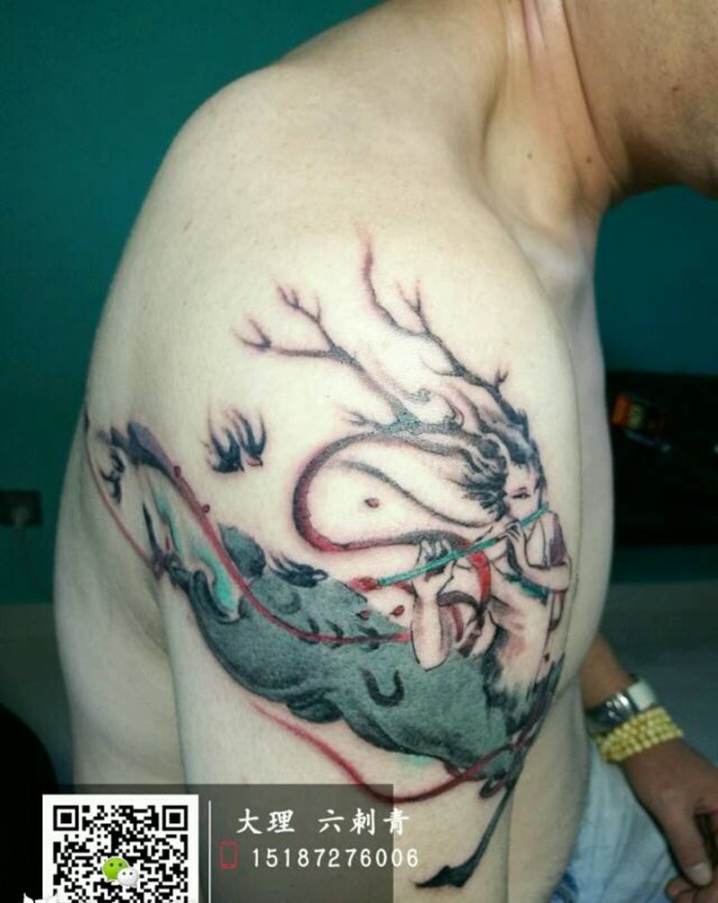 当前位置: 首页 >云南省大理白族自治州纹身店-不倒翁刺青穿孔(大理店)纹身图案>九色鹿纹身图片_肩部清新鬼神六刺青大理成品纹身图案