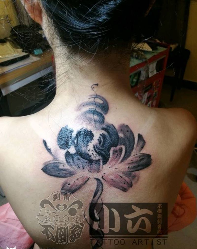 水墨莲花纹身图片_背部国画植物原创成品纹身图案