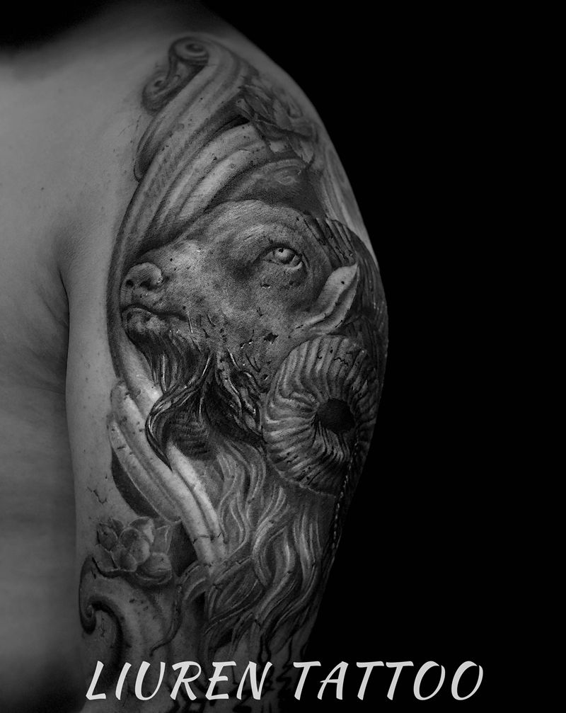 当前位置: 首页 >云南省大理白族自治州纹身店-流刃刺青纹身图案>生肖浮雕羊首纹身图片_手臂欧美写实纹身图案