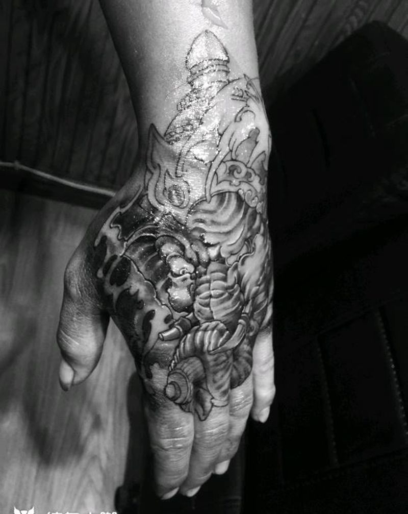 象神纹身图片_手部传统鬼神成品纹身图案