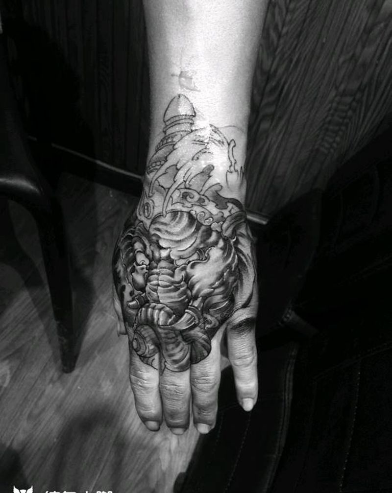 象神纹身图片_手部传统鬼神成品纹身图案