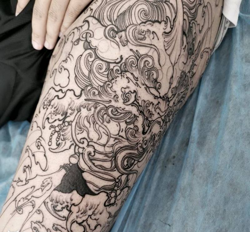 • T网红王老大花腿龙纹身图片_腿部新传统纹身图案