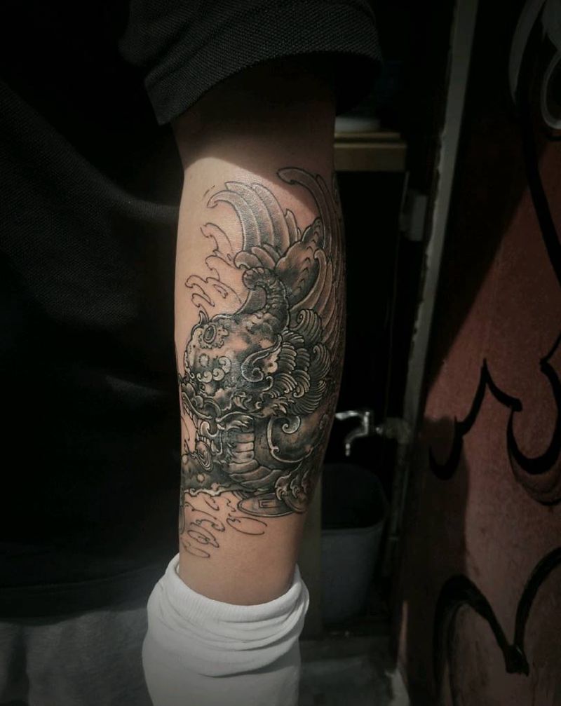 • T网红王老大花腿龙纹身图片_腿部新传统纹身图案