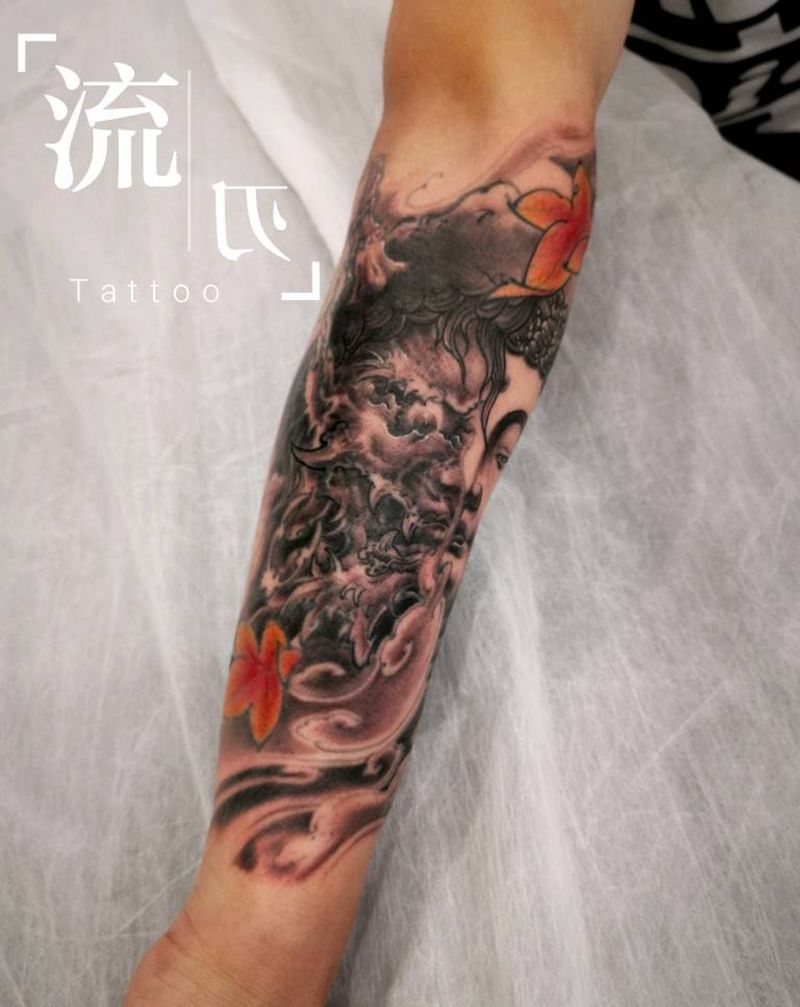 当前位置: 首页 >云南省大理白族自治州纹身店-流刃刺青纹身图案>一念之间纹身图片_手臂新传统纹身图案