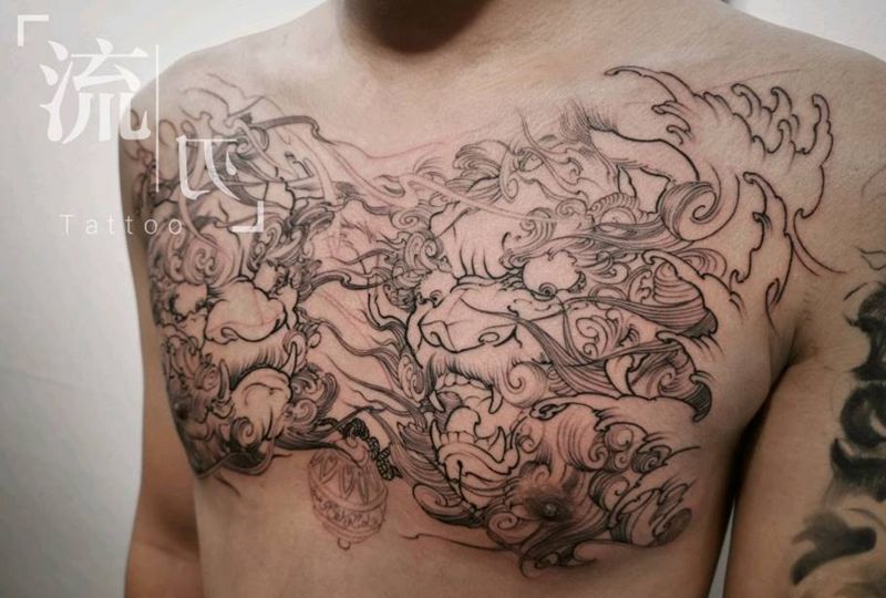 当前位置: 首页 >云南省大理白族自治州纹身店-流刃刺青纹身图案>富贵双狮纹身图片_胸部新传统纹身图案