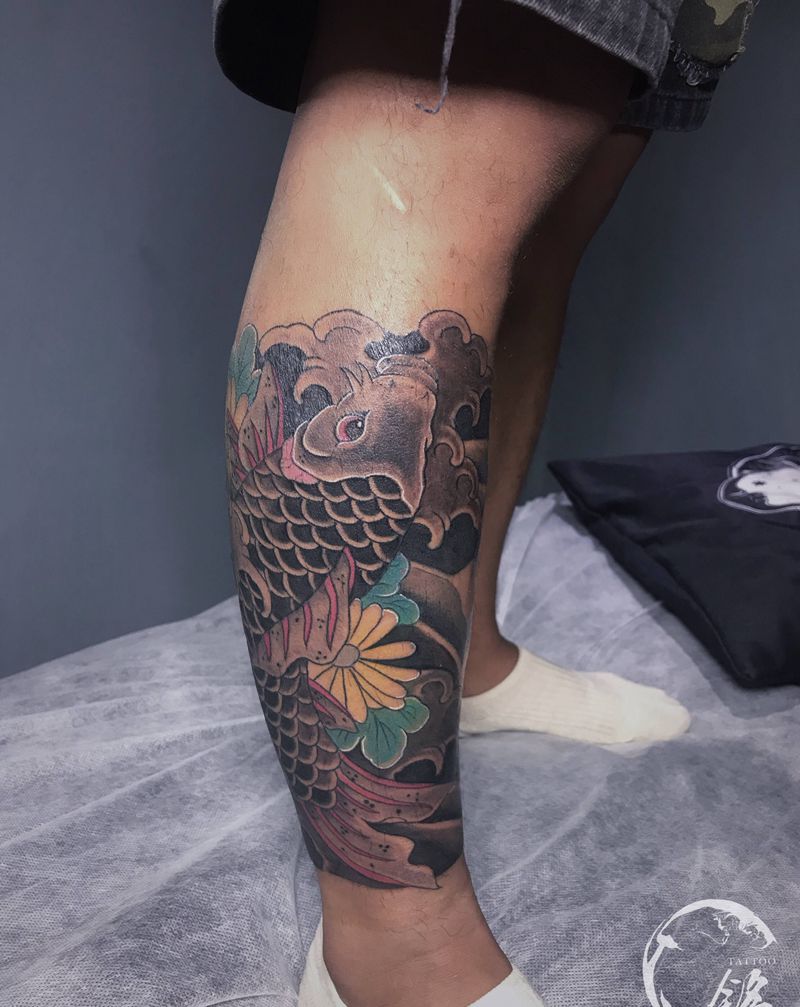 当前位置: 首页 >云南省大理白族自治州纹身店-铭刺青纹身图案>老传统鲤鱼纹身图片_腿部脚部老传统纹身图案