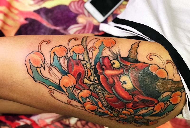 • T包小腿吹火男+阿多福纹身图片_腿部老传统新传统吹火男阿