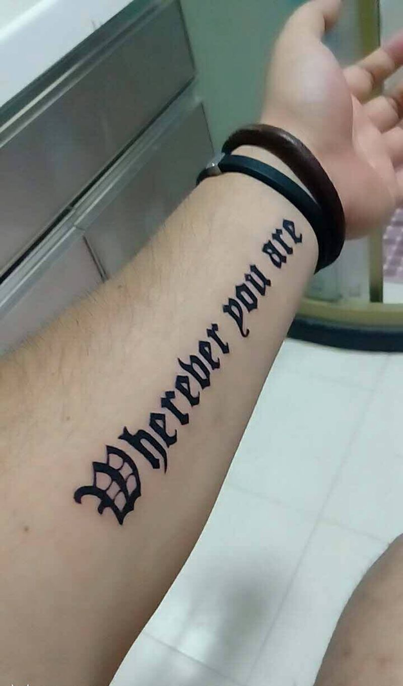 当前位置: 首页 >陕西省西安市纹身店-十度刺青纹身图案>哥特字纹身图片_字符手臂成品纹身图案