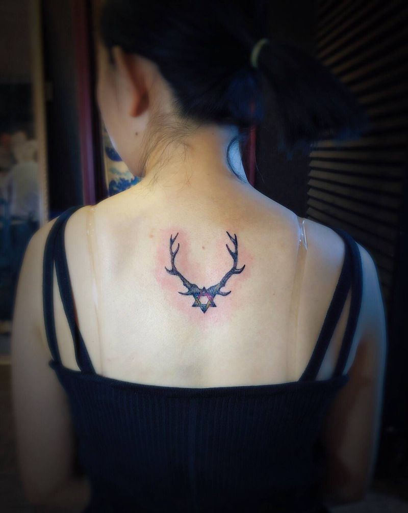 当前位置: 首页 >陕西省西安市纹身店-十度刺青纹身图案>鹿角六芒星纹身图片_背部点刺纹身图案