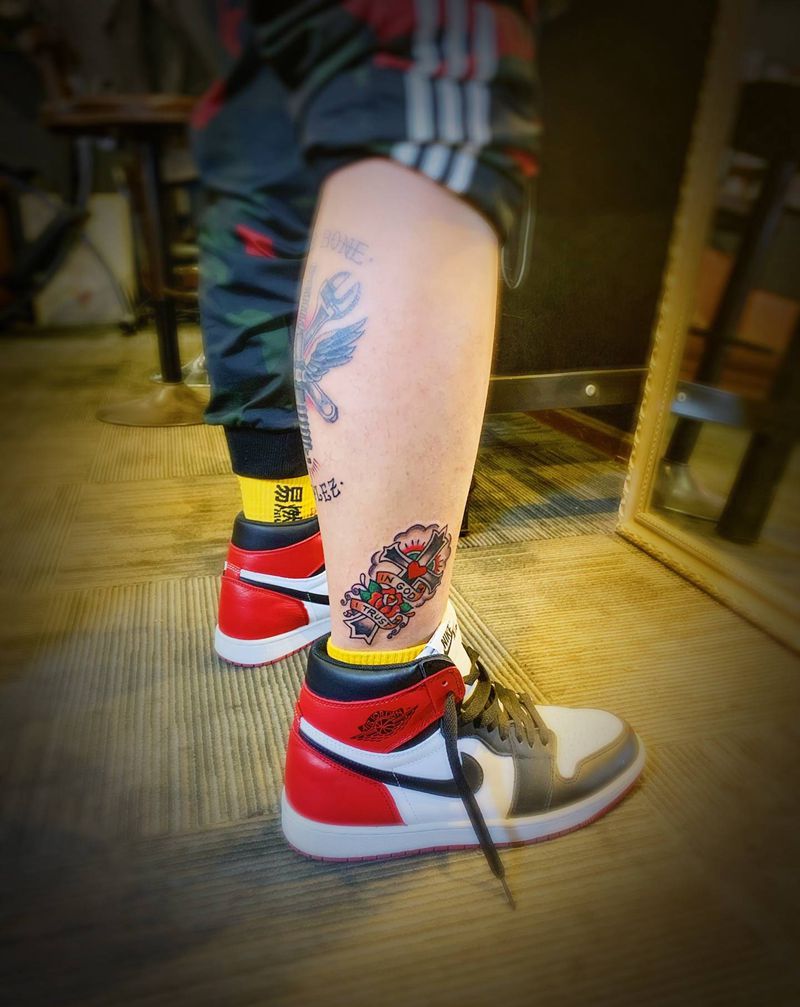 • T包小腿吹火男+阿多福纹身图片_腿部老传统新传统吹火男阿