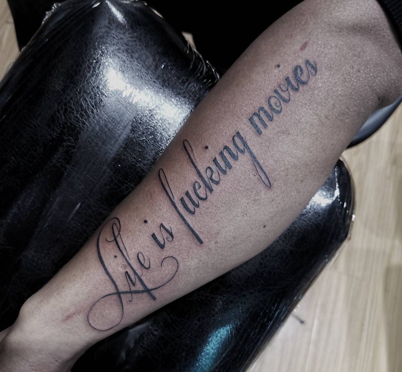 当前位置: 首页 >四川省成都市纹身店-青-刺青工作室纹身图案>人生如戏纹身图片_手臂花体字纹身图案