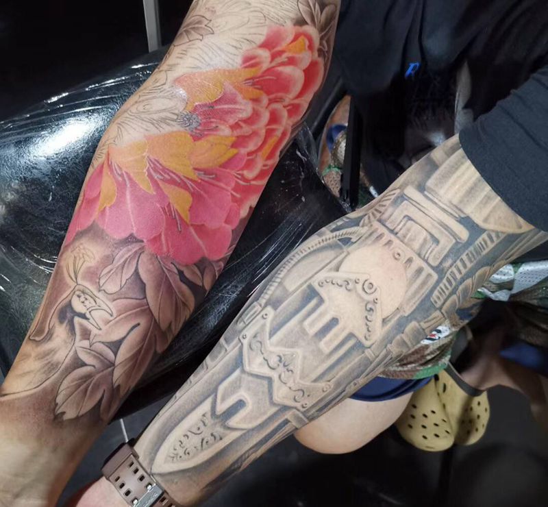 孔雀牡丹花臂2纹身图片_手臂新传统孔雀牡丹纹身图案