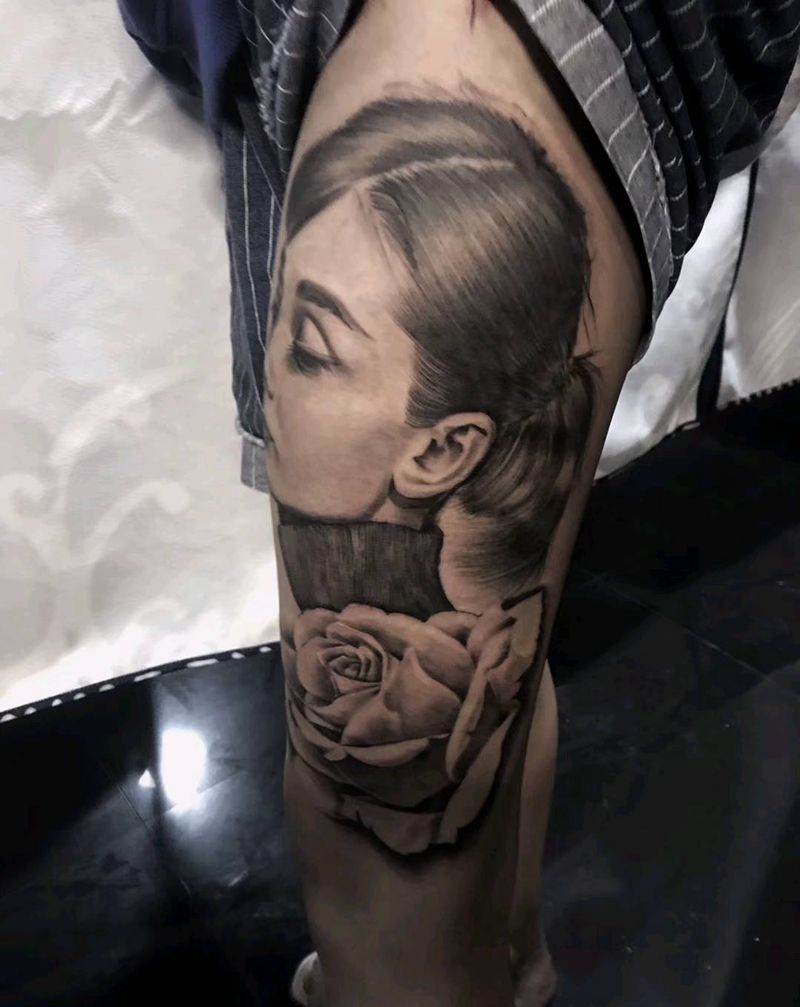 奥黛丽赫本肖像纹身图片_腿部欧美写实肖像玫瑰纹身图案