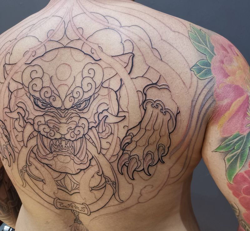 当前位置: 首页 >四川省成都市纹身店-青-刺青工作室纹身图案>半背狮子纹身图片_背部新传统狮子半背纹身图案