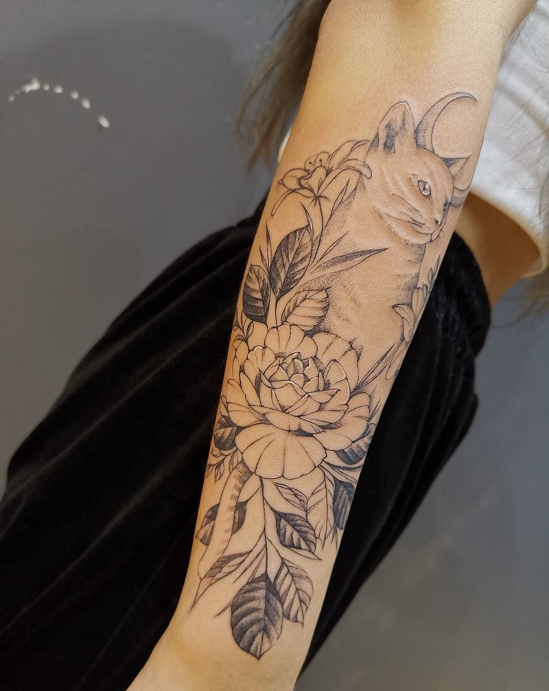 小臂素花纹身图片_手臂点刺素花猫纹身图案