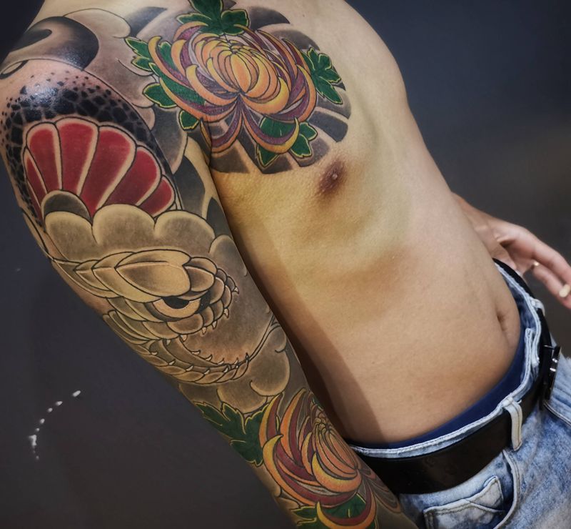 当前位置: 首页 >四川省成都市纹身店-青-刺青工作室纹身图案>蛇 菊花 七分袖纹身图片_手臂老传统蛇菊花七分袖纹身图案