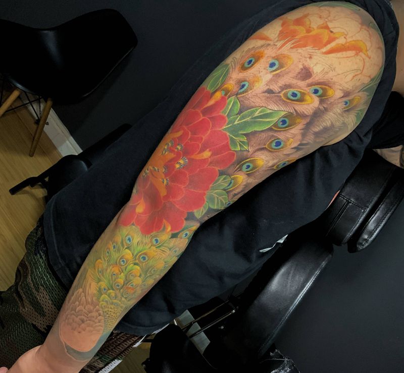 当前位置: 首页 >四川省成都市纹身店-青-刺青工作室纹身图案>孔雀花臂纹身图片_手臂新传统孔雀牡丹纹身图案