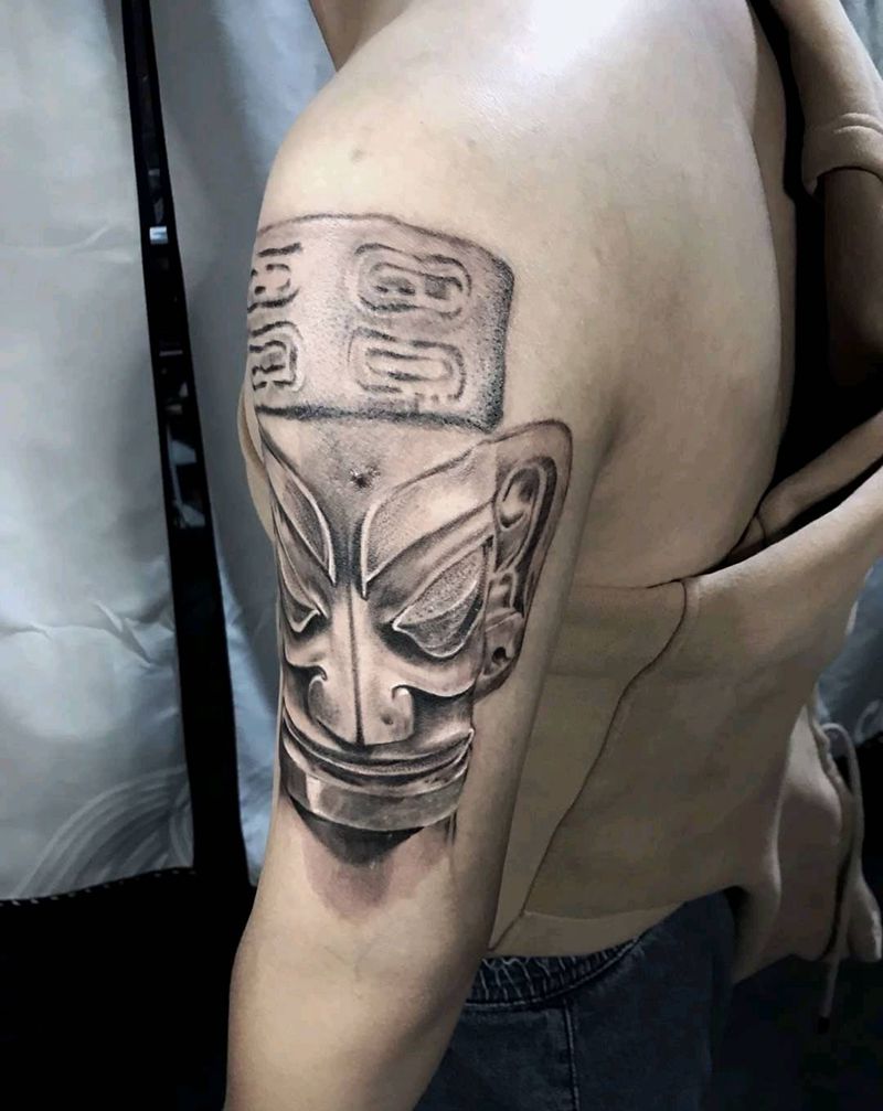三星堆青铜人像纹身图片_手臂欧美写实纹身图案