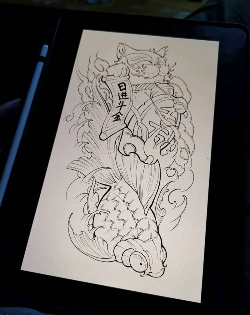 招财猫(未完成)纹身图片_腿部新传统招财猫金鱼纹身图案