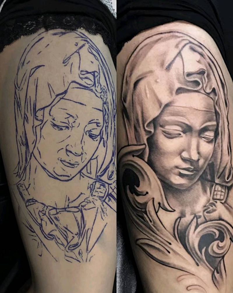 当前位置: 首页 >四川省成都市纹身店-青-刺青工作室纹身图案>圣母纹身图片_腿部欧美写实圣母雕塑纹身图案