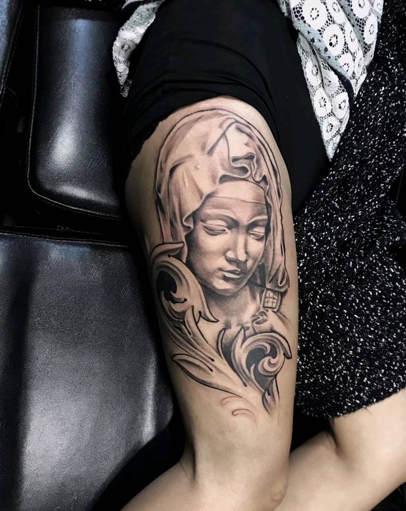圣母纹身图片_腿部欧美写实圣母雕塑纹身图案