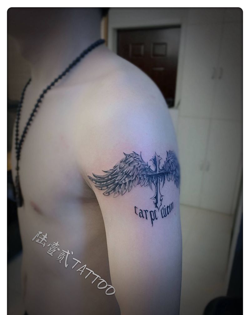 当前位置: 首页 >陕西省西安市纹身店-陆壹贰刺青纹身图案>翅膀+英文纹身图片_手臂纹身图案
