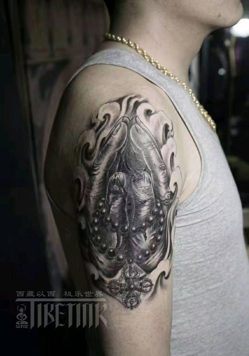 当前位置: 首页 >西藏拉萨市纹身店-西藏极乐世界纹身纹身图案>合十双手遮纹身图片