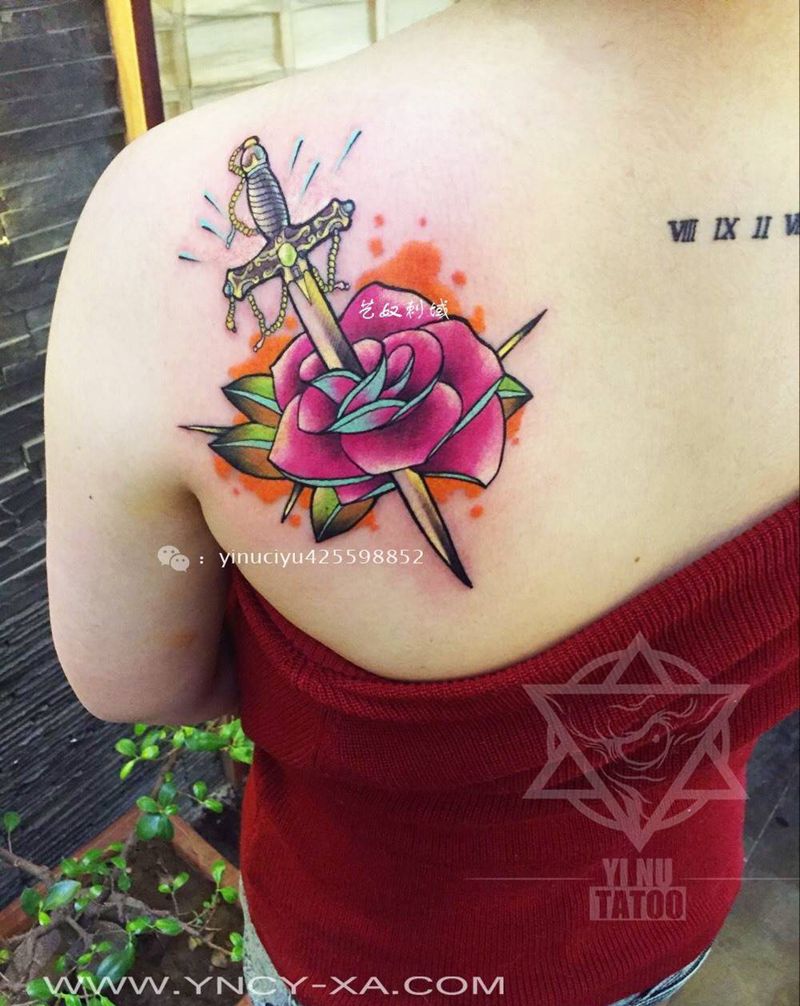 原创玫瑰-剑纹身图片_成品背部欧美原创艺奴刺域花纹身图案