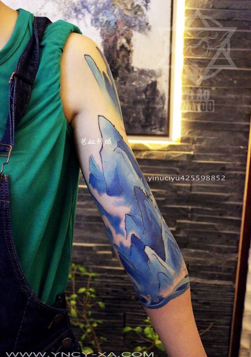 原创山水臂纹身图片_成品手臂传统原创艺奴刺域纹身图案