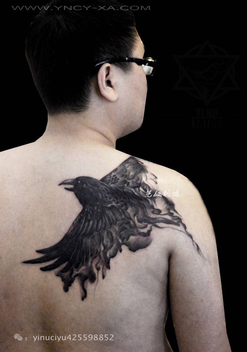 当前位置: 首页 >陕西省西安市纹身店-艺奴刺域纹身图案>乌鸦纹身图片_成品背部国画动物艺奴刺域纹身图案