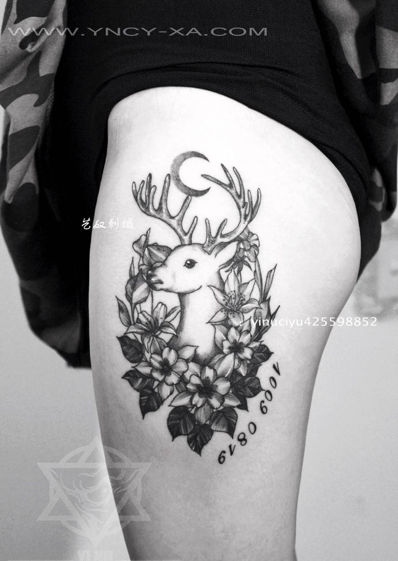 唯美鹿纹身纹身图片_成品腿部清新艺奴刺域动物纹身图案