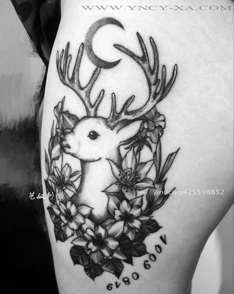 唯美鹿纹身纹身图片_成品腿部清新艺奴刺域动物纹身图案