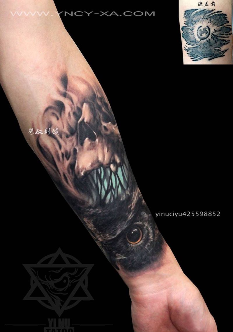 当前位置: 首页 >陕西省西安市纹身店-艺奴刺域纹身图案>原创设计遮盖纹身图片_成品手臂写实原创动物鬼神艺奴刺域纹身图案