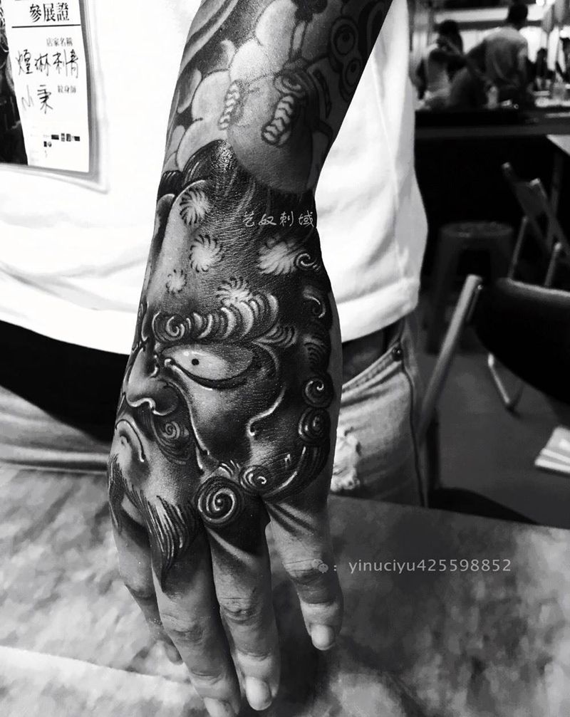 原创唐狮包手纹身图片_成品手部传统原创艺奴刺域纹身图案