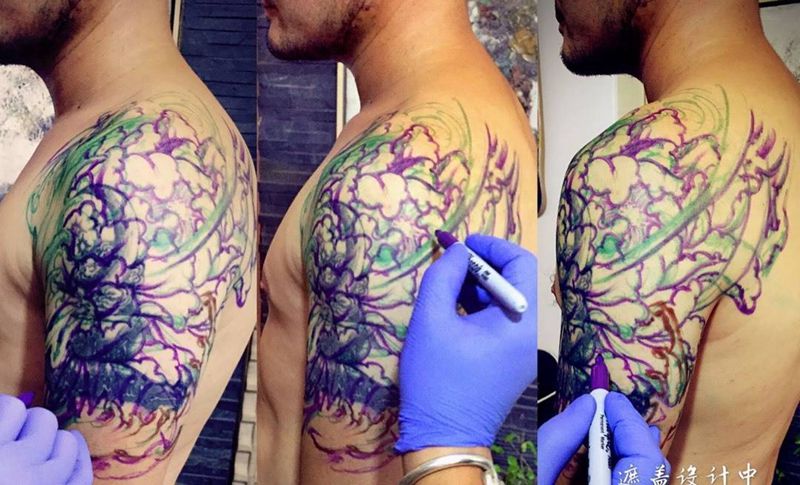 原创牡丹遮盖纹身图片_成品手臂肩部传统花原创艺奴刺域纹身图案
