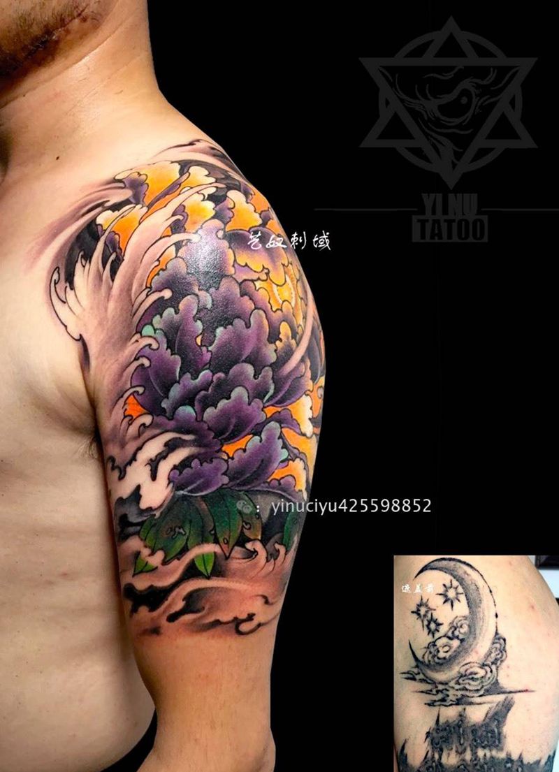 原创牡丹遮盖纹身图片_成品手臂肩部传统花原创艺奴刺域纹身图案