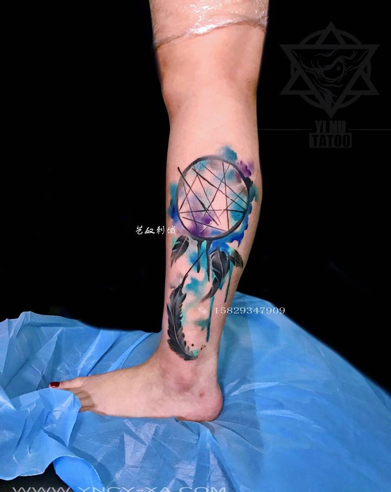 当前位置: 首页 >陕西省西安市纹身店-艺奴刺域纹身图案>捕梦网遮盖纹身图片_成品腿部清新艺奴刺域纹身图案